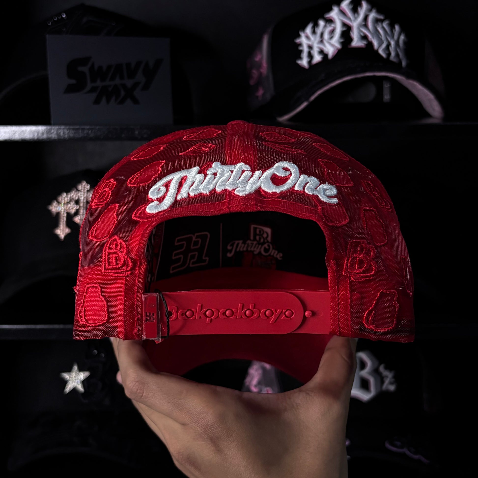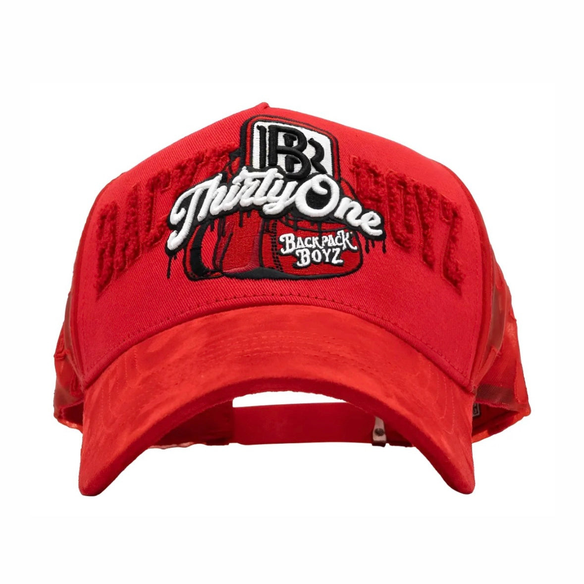 La gorra 31 Hats x Backpackboyz “La Mochila” es una colaboración llamativa que combina un color rojo intenso con bordados protagonistas en el frente y laterales.