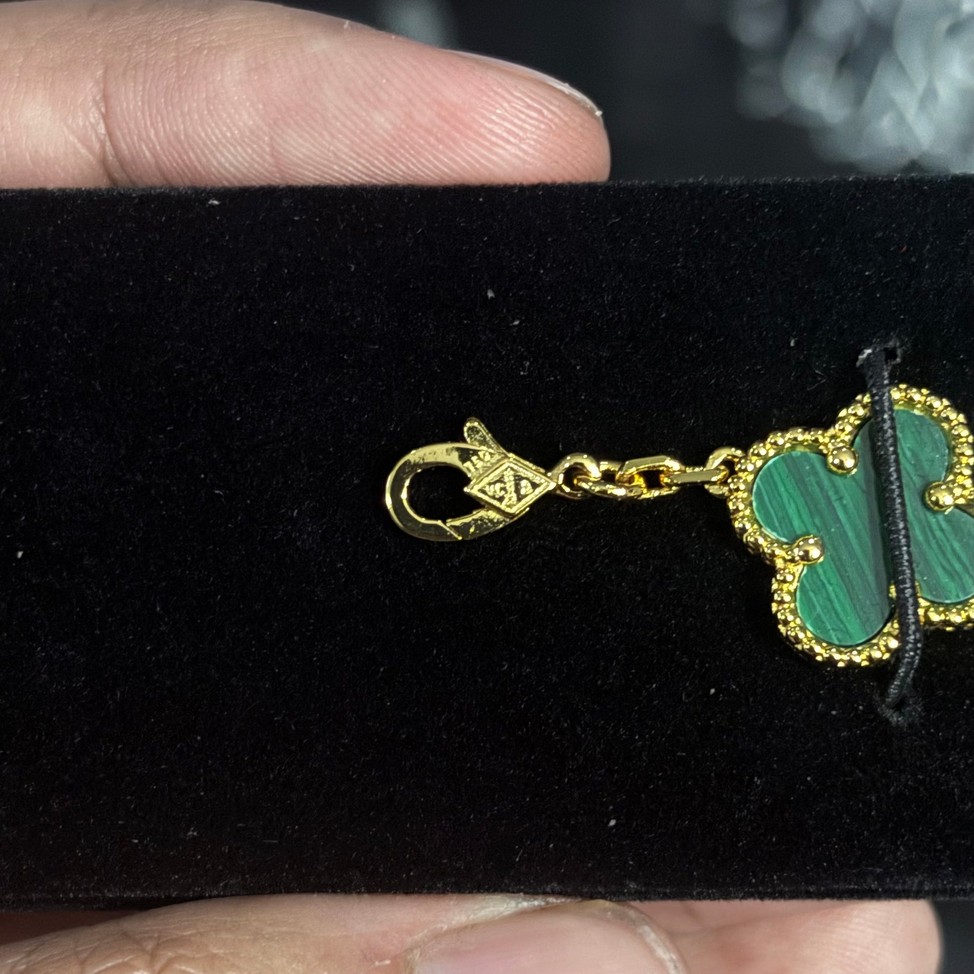 La Van Cleef Malaquita & Diamante 14K combina lo mejor de dos mundos: el verde profundo de la malaquita con el brillo sutil de los detalles tipo diamante. El contraste crea una pieza elegante, llamativa y con mucha presencia, perfecta para elevar cualquier outfit sin esfuerzo.